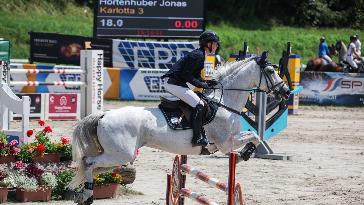 23.07.2023 - In Lassee oje, in Zeltweg ole! Jonas Hörtenhuber siegt diesmal im Stechen mit seiner 14-jährigen Schimmel-Stute Karlotta mit einer fehlerfreien Runde in einer Zeit von 43,53 Sekunden, ganze 11 Hundertstelsekunden vor der Zweitplatzierten Steirerin Tanja Mayerl auf Fairytale JH (0/43,64). Dritter wurde Florian Starzacher (K) mit Ora (0/44,70).