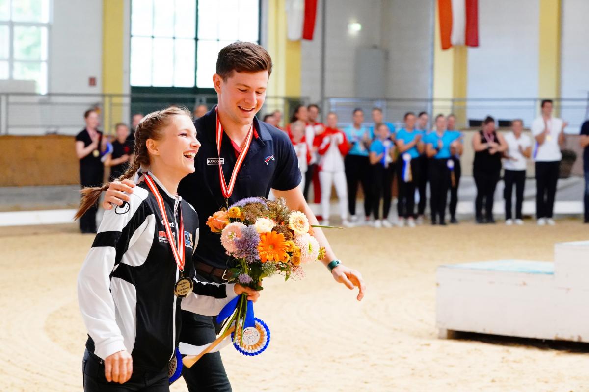 Bei den Österreichischen Staatsmeisterschaften war es dann so weit. Jasmin Lindner konnte sich ihren vorläufig letzten wichtigen nationalen Titel sichern. Knapp zwei Wochen später sollte das CVI in Stadl-Paura der letzte Wettkampf sein, dabei kam es zu einer großartigen Premiere. „Es war eine spontane Aktion. Ich habe eine Woche davor mit Lambert (Anm.: Leclezio; amtierender Weltmeister aus Frankreich) hin- und hergeschrieben, ob er uns nicht besuchen möchte. Er ist tatsächlich gekommen. Erstmals in der Geschichte sind zwei amtierende Weltmeister gemeinsam eingelaufen. Wir haben beide WM-Titel im selben Jahr (Anm.: 2016 und 2021) gemacht, das verbindet uns. Es war wirklich ein berührender Moment für mich, auch weil viele Freunde und Familienmitglieder dabei waren“, strahlt die Tirolerin, als sie von ihrem großen Abschied, der am Ende des Bewerbs zelebriert wurde, erzählt.