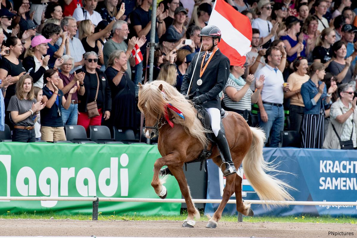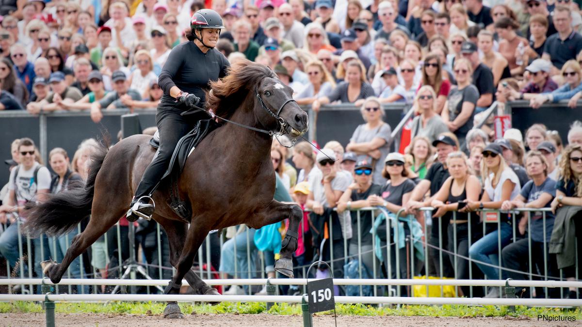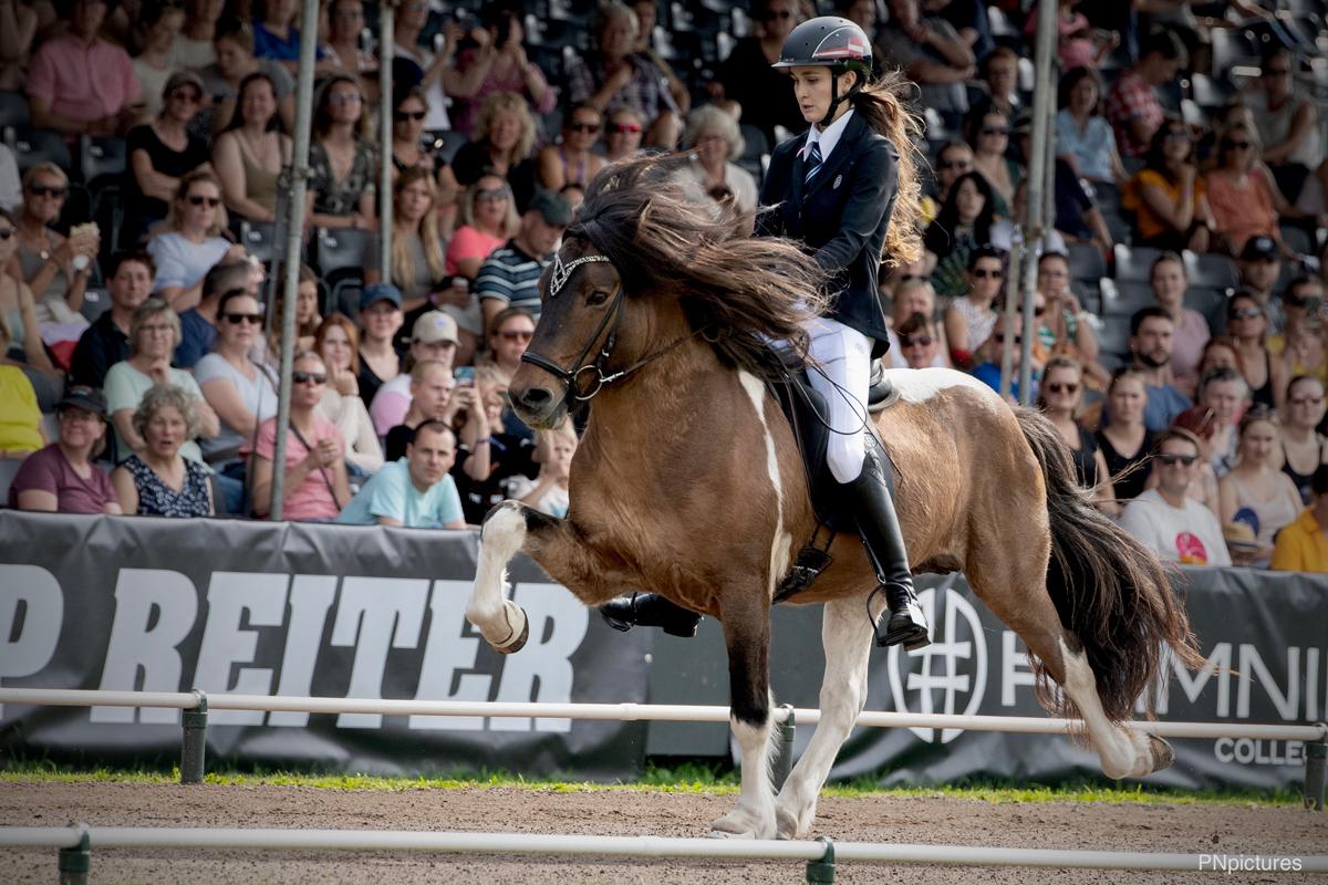 Anna (Bild unten) und Gerrit Sager, sportliches Mutter-Tochter Gespann in der Islandpferdeszene konnten in ihren Bewerben (Tölt T1 bzw. T2 und Viergang) jeweils das B-Finale erreichen. Anna Sager erritt mit ihrem Steggur in der Klasse der Jungen Reiter hier Platz 2 im Viergangpreis und Rang 3 im Töltpreis. Gerrit Sager wurde mit Kveikur Dritte im B-Finale der Töltprüfung T2, bei der auch das anspruchsvolle Zügelüberstreichen gezeigt werden muss. Zur Erklärung: In jedem Ovalbahnbewerb gibt es eine Vorentscheidung an der alle Reiter:innen in Einzelritten teilnehmen. Die besten 5 Reiter:innen der Vorentscheidung qualifizieren sich direkt für das A-Finale, in welchem dann im direkten Vergleich um den Weltmeistertitel geritten wird. Diejenigen, die nach der Vorentscheidung auf Platz 6 bis 10 sind, kommen in das B-Finale. Der/die Sieger:in des B-Finales rückt in das A-Finale nach, die anderen reiten um die Platzierungen 7 bis 10.