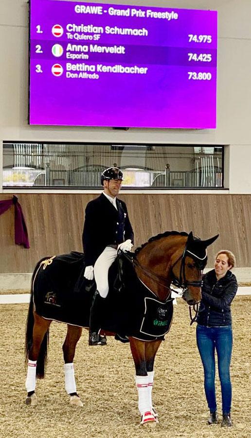 03.04.2023 - Starke Auftritte der heimischen Dressur-Equipe beim zweiten internationalen Dressurturnier am vergangenen Wochenende im steirischen Gössendorf. In der Kür-Tour siegte Florian Bacher mit Amonitas im Grand Prix vor Bettina Kendlbacher auf Broadmoars Don Alfredo AWO und Christian Schumach auf Te Quiero SF. In der Kür holte sich Christian Schumach mit Te Quiero SF den Sieg, gefolgt von Anna Merveldt auf Esporim und Bettina Kendlbacher auf Broadmoars Don Alfredo AWO.