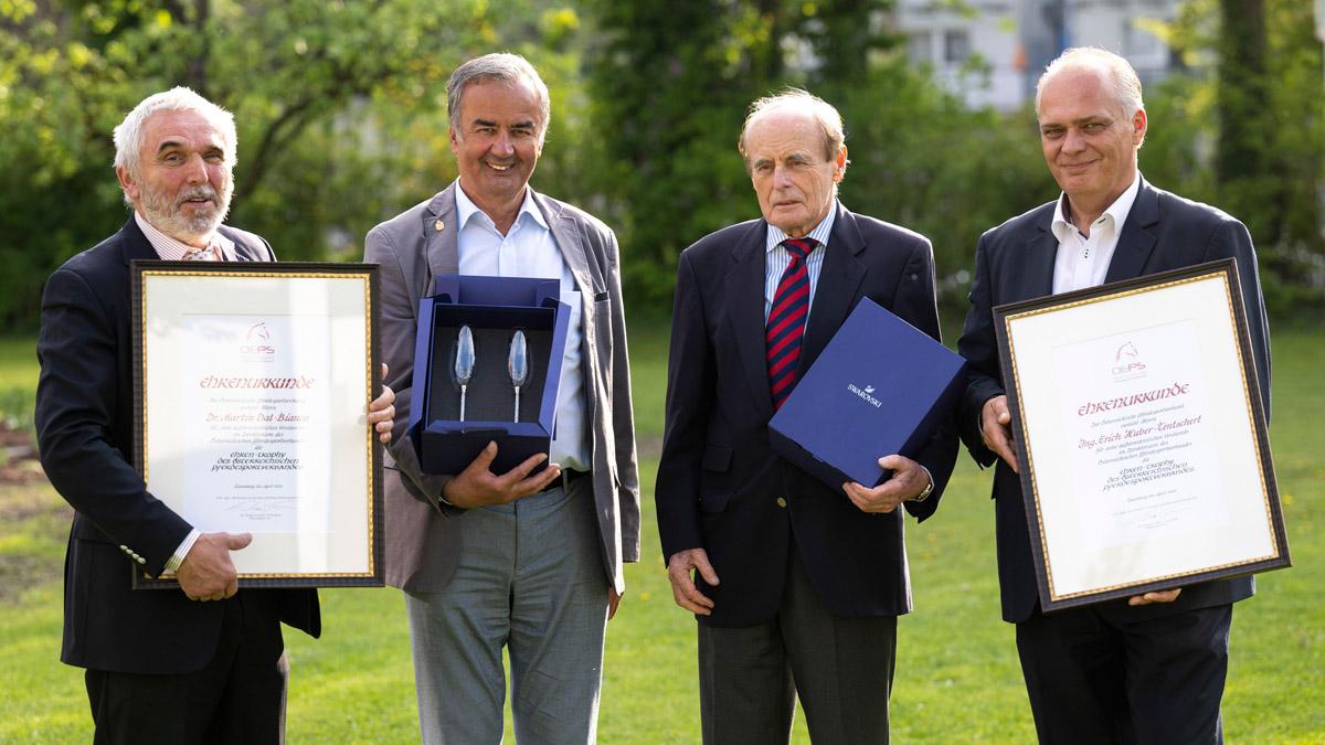 Wahlleiter Dr. Johann Lueger wurde zum krönenden Abschluss einer rundum harmonischen Generalversammlung von der frisch wiedergewählten Präsidentin Elisabeth Max-Theurer geehrt. Der gebürtige Oberösterreicher, der neben vielen anderen ehrenamtlichen Tätigkeiten von 2003 bis 2016 als erfahrener Jurist Vorsitzender des Obersten Berufungs- und Strafausschusses des OEPS gewesen war, erhielt die Ehrennadel des Österreichischen Pferdesportverbandes in Gold.