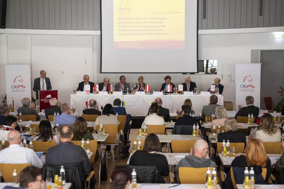 25.04.2022 - Mit großer Mehrheit wurde Präsidentin Elisabeth Max-Theurer zum fünften Mal in Folge bei der Generalversammlung des Österreichischen Pferdesportverbandes am 25. April 2022 in Salzburg bestätigt. Außerdem wählten die 102 Delegierten ein neues Direktorium.
