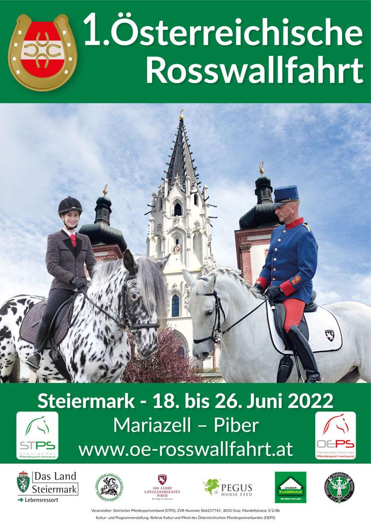 06.04.2022 - Das wird eine Premiere der Extraklasse! Die 1. Österreichische Rosswallfahrt findet nach zwei Coronavirus-bedingten Verschiebungen vom 18. bis 26. Juni 2022 statt. Sie führt Pferdefreunde auf der Strecke Mariazell – Niederalpl – Turnau – Thörl – Oberort (Tragöß) – Maria Freienstein – St. Michael – St. Stefan ob Leoben – Maria Schnee auf der Gleinalm – Maria Lankowitz – Piber durch die malerische Landschaft der Steiermark.