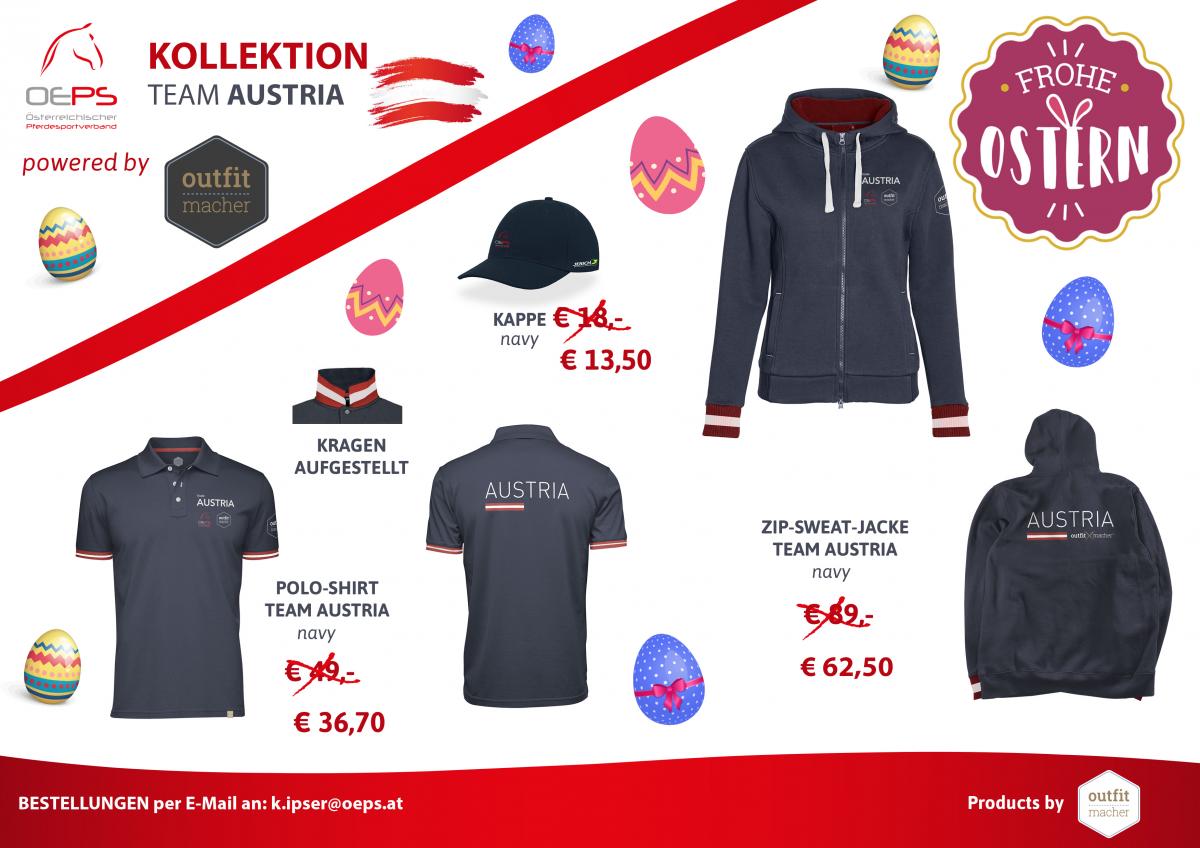 02.03.2021 - Das perfekte Ostergeschenk für jeden Reitsport-Fan. Bestelle noch vor Ostern Teile der stylischen Team-Austria-Fan-Kollektion powered by Outfitmacher zu Sonderpreisen. Bestellungen bitte bis Freitag, den 02. April 2021 an k.ipser@oeps.at. Lieferung ist gegen Vorauskasse möglich!
