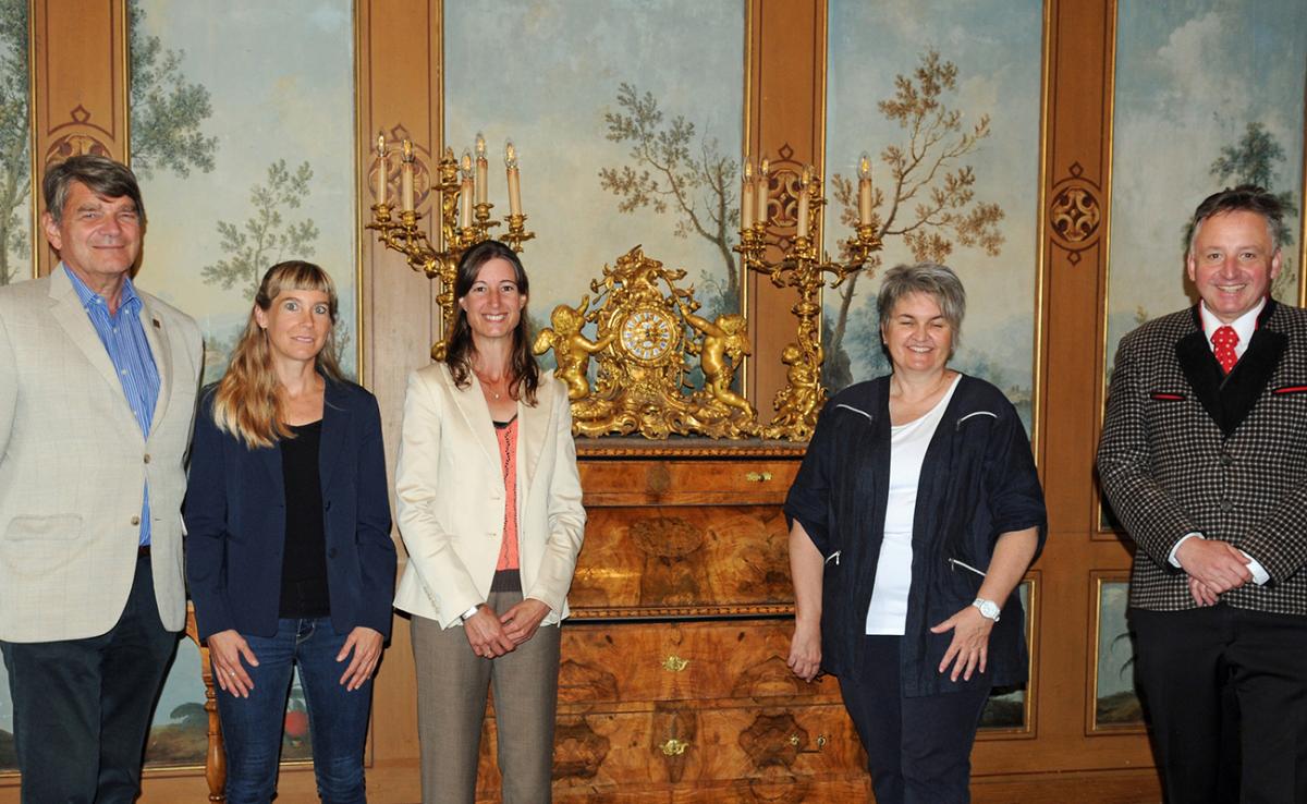 Foto Empfang in der Papstsuite des Klosters Einsiedeln (v.l.n.r.): Präsident Charles Troillet (Schweizerischer Verband für Pferdesport), Muriel Willi (Kunsthistorikerin), Olivia Cortesi (Delegationsleiterin der Pferdesportler mit Einsiedler Pferden bei der 1. Österreichischen Rosswallfahrt 2022), Geschäftsführerin Esther Weiss (Stiftung zur Förderung der Einsiedler Marstallzucht - Für das Einsiedler Pferd), Bundeskulturreferent Otto Kurt Knoll (Österreichischer Pferdesportverband)