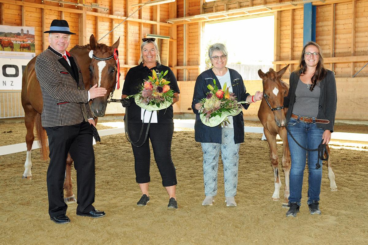 Foto Siegerfohlen der Einsiedler Pferde 2021 (v.l.n.r.): Bundeskulturreferent Otto Kurt Knoll (Österreichischer Pferdesportverband), Einsiedler Stute (Mutter des Siegerfohlens), Züchterin Ursi Kälin des Siegerfohlens, Geschäftsführerin Esther Weiss (Stiftung zur Förderung der Einsiedler Marstallzucht - Für das Einsiedler Pferd), Siegerfohlen X-Tra MKE, Präsidentin Jenny Schindler (Pferdezuchtgenossenschaft Einsiedeln)