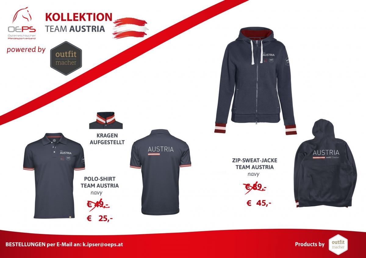 Bestelle deine reduzierte Team Austria-Kollektionsware (es sind nur noch große Größen vorhanden) per Email unter k.ipser@oeps.at (Versand gegen Vorauskasse)