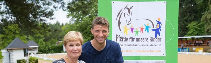 Turnier-Chefin Sissy Max-Theurer mit Fußball-Weltmeister Thomas Müller, der Botschafter von "Pferde für unsere Kinder" ist. Foto (c) Michael Rzepa