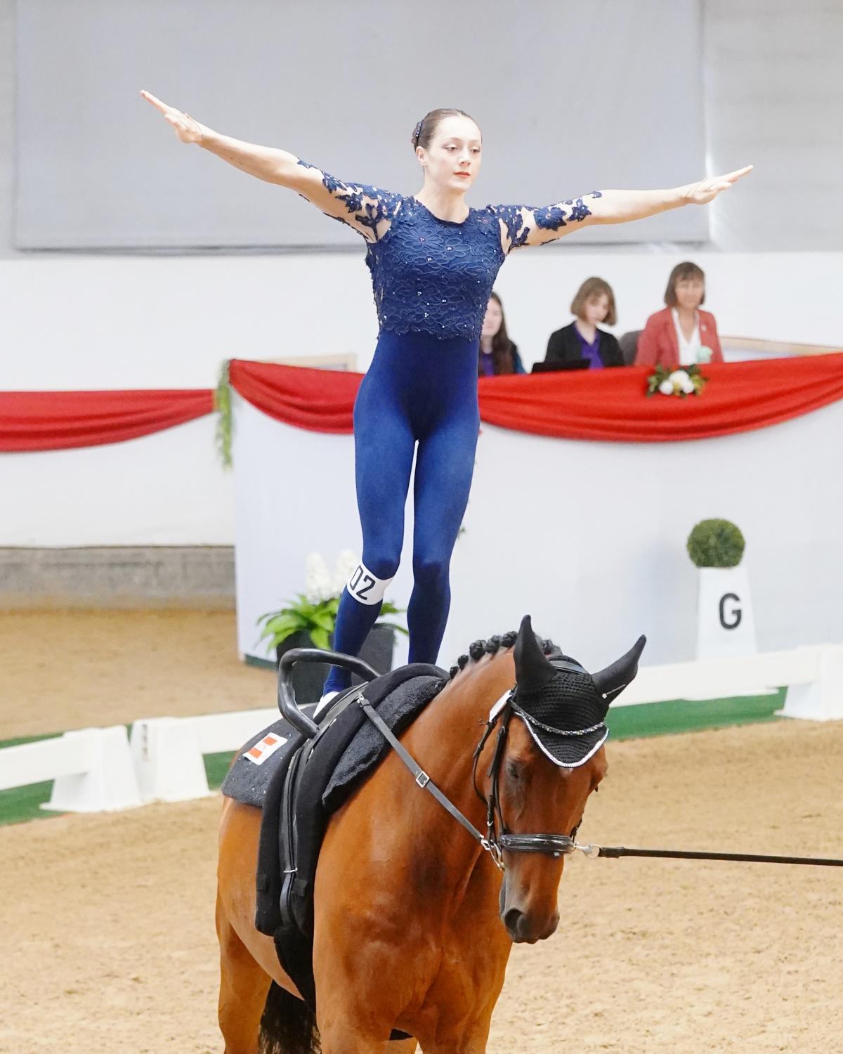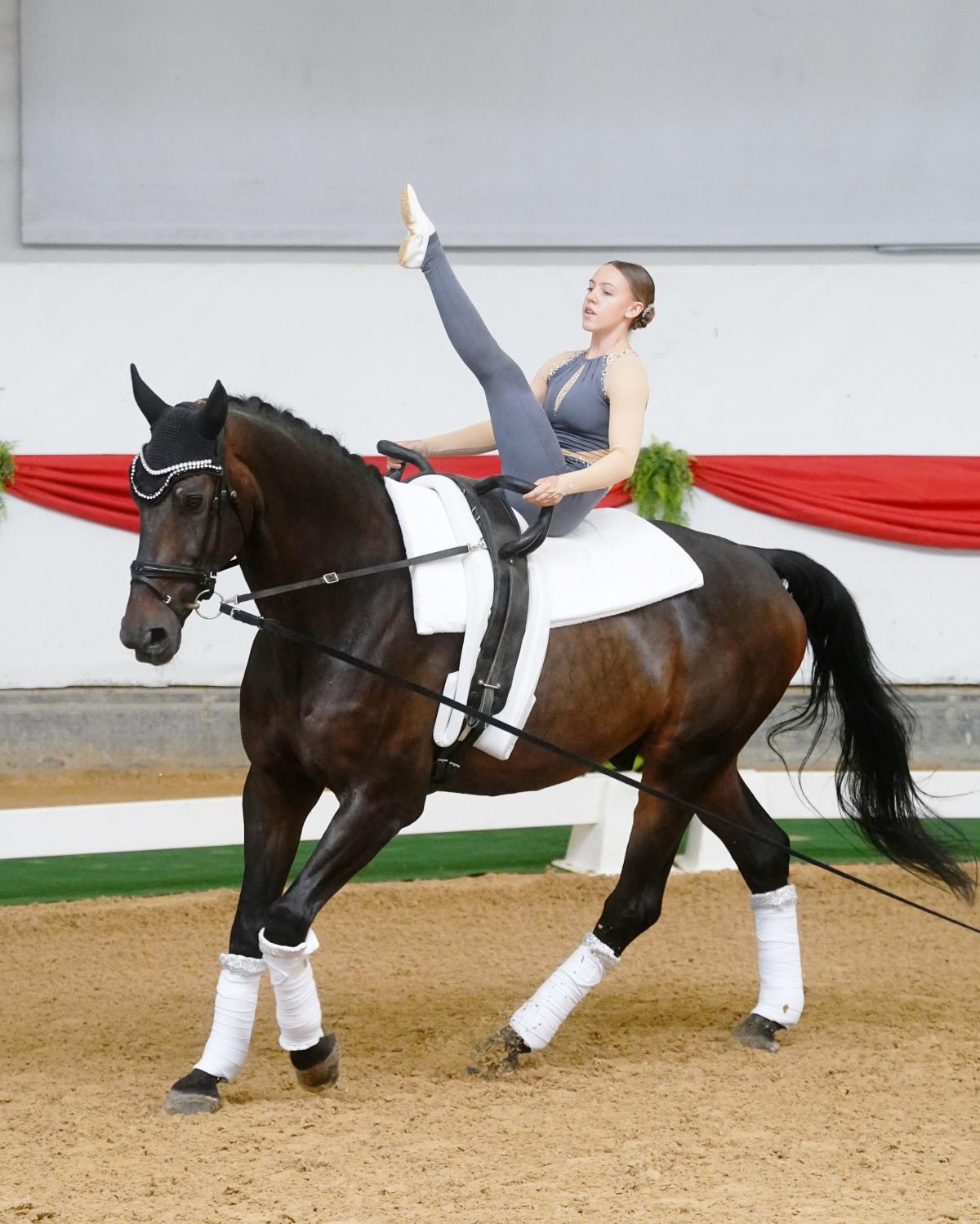 Als letzter Programmpunkt des Tages vor der Eröffnung stand der erste Bewerb der Europameisterschaften im Voltigieren der Allgemeinen Klasse auf dem Programm. 21 Voltigiererinnen aus 12 Nationen waren am Start und mit Kathrin Meyer (GER) ist die amtierende Europameisterin nach der Pflicht mit einer Note von 8,796 klar auf Medaillenkurs. Wie erwartet sind ihre Teamkollegin Alice Layher, die Bronzemedaillengewinnerin der Weltmeisterschaft 2024, sowie Alina Ross, die Silbermedaillengewinnerin 2023 und Vizemeisterin 2024, ebenfalls sehr stark und liegen mit 8,737 und 8,382 auf den Zwischenrängen 2 und 3.