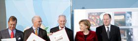Das Foto zeigt von links: Klaus Pavel (WEG-Aachen), Franz Beckenbauer (Fußball-WM), Hans Wilhelm Gäb (Vorsitzender des Vorstands der Stiftung Deutsche Sporthilfe), Dr. Angela Merkel, Peer Steinbrück, Wolfgang Schäuble