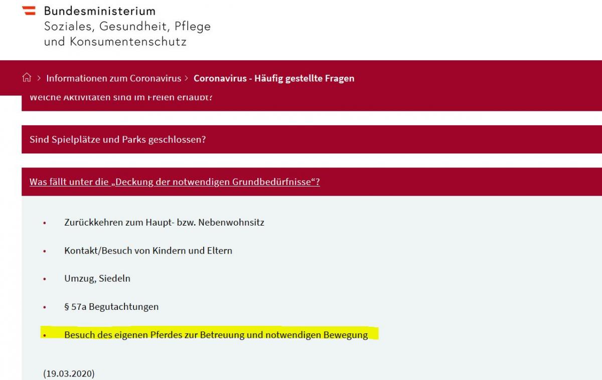 Mittlerweile fällt laut Seite des Bundesministeriums für Soziales, Gesundheit, Pflege und Konsumentenschutz auch der "Besuch des eigenen Pferdes" unter "Deckung der notwendigen Grundbedürfnisse"...