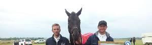 Foto zeigt von links Daniel Dunst, seine Stute Miami Forever und Manfred Rust mit Siegestrophäe © Michaela Iglhauser