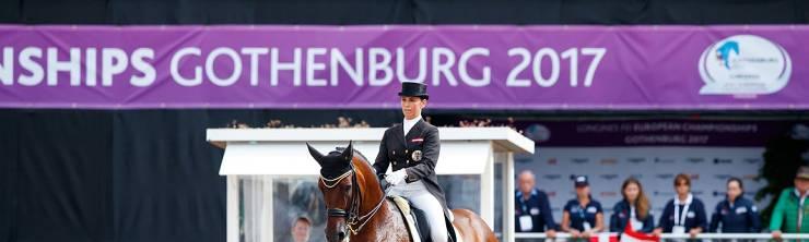 Staatsmeisterschaft am Gutenhof. Von 22. bis 24. September 2017 kämpfen die besten Dressurreiterinnen und Dressurreiter Österreichs im Viereck vom Gutenhof um Gold, Silber und Bronze. EM-Sensation Belinda Weinbauer kommt mit Söhnlein Brilliant als Titelverteidigerin. 114 genannte Pferde, 93 Reiterinnen und Reiter, 21 Bewerbe und 7 Medaillensätze – das sind die Zahlen und Fakten für das Dressur-Staatsmeisterschafts-Wochenende im niederösterreichischen Himberg. Als Favoriten-Duo reiten Belinda Weinbauer und ihr 15-jähriger Sportpartner Söhnlein Brilliant MJ ins Viereck ein. Die im Burgenland lebende 41-jährige Oberösterreicherin war als EM-Debütantin mit Marianne Jerichs Pferd die große Überraschung in Göteborg. Platz 14 bei der EM und Rang 41 in der Weltrangliste sind die zahlgewordenen sportlichen Ausrufezeichen. (Im Bild: Belinda Weinbauer und Söhnlein Brilliant MJ © OEPS | Tomas Holcbecher)
