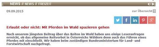 Die Pferderevue schreibt: "Erlaubt oder nicht: Mit Pferden im Wald spazieren gehen? Nach unserem jüngsten Beitrag über das Reiten im Wald haben uns einige Leseranfragen erreicht, ob das allgemeine Reitverbot in Österreichs Wäldern denn auch das Führen eines Pferdes mit einschließt. Wir haben beim zuständigen Bundesministerium für Land- und Forstwirtschaft nachgefragt. Die ernüchternde Antwort lautet: Ja, der § 33 Abs. 3 ForstG, der das Reiten als eine über das Betreten zu Erholungszwecken im forstgesetzlichen Sinn hinausgehende Nutzungsart einstuft, gilt auch für das Führen eines Pferdes. Damit bedarf es sowohl für das Reiten als auch das Spazieren gehen mit dem Pferd einer Zustimmung durch den Waldeigentümer."