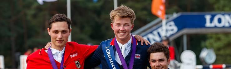 Das U21-Siegerbild der Springreit-EM 2018 in Frankreich: Felix Koller (r.) bekommt nun nachträglich von der FEI die Silbermedaille zugesprochen, weil das Pferd des Briten Harry Charles (Bildmitte) positiv auf Lidocain getestet wurde. Foto (c) OEPS | Tomas Holcbecher