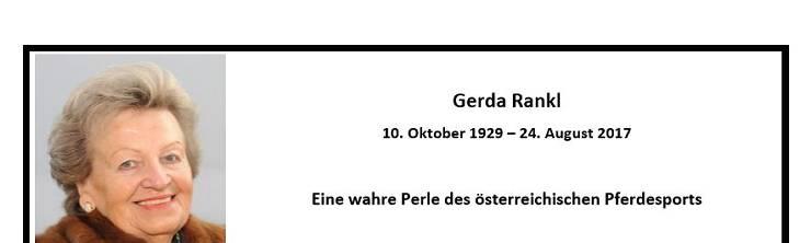 Eine wahre Perle des österreichischen Pferdesports. Wohltuend unauffällig, liebenswürdig, charmant, einfühlsam, klug und weise war Gerda Rankl, die darüber hinaus einen enormen Sachverstand und fundamentale Pferdekenntnis besaß. Ein Nachruf auf Gerda Rankl (10. Oktober 1929 – 24. August 2017) von Mag. Klaus Haim und Elisabeth Max-Theurer.