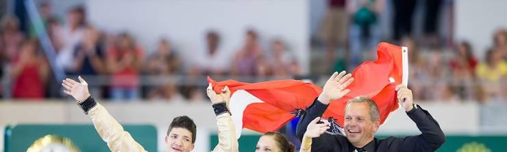 Die Welt- und Europameister Lukas Wacha und Jasmin Lindner (hier im Bild mit Longenführer Klaus Haidacher beim Jubel über den EM-Titel in Aachen 2015) sind seit Jahren im Pas de Deux das Maß aller Dinge - bei der Heim-EM im Magna Racino gilt das Tiroler Traumpaar auch heuer wieder als ganz große Medaillenhoffnung. Foto © OEPS | Tomas Holcbecher