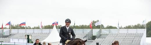 „Ich danke meiner Fine Feeling, dass sie mich trotz Regen durch diesen Team Test getragen hat. Ich hatte vorher wirklich befürchtet, dass es ihr zu nass ist und sie mit mir nicht einmal das Viereck betritt“, lobte Paralympics-Goldmedaillengewinner Pepo Puch seine Stute nach ihrer Performance im Para-Dressurstadion im Hippodrom von Caen. Nach den 76,520 Prozent und Platz 2 des Grade1b-Duos und den 64,789 Prozent (Platz 2) von Teamkollege Bernd Brugger in Grade 3 liegt Österreich auf dem sensationellen zweiten Platz. Im Vorjahr schaffte Österreichs Para-Team Platz 8 bei der EM in Herning.