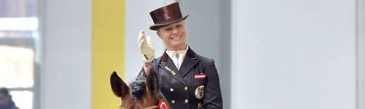 „Es war eine sehr harmonische Runde mit vielen Höhepunkten“, analysiert Victoria Max-Theurer nach dem Grand Prix-Sieg ihren Auftritt und lobt ihre 14-jährige Hannoveraner Stute Blind Date (Stallname: Beate) für ihre Form nach der Winterpause. „Beate hat gut mitgearbeitet und vor allem schön piaffiert.“