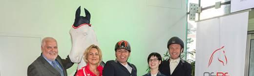 Verabschiedung des Para-Team im Studio 44 im Haus der Österreichischen Lotterien mit der neuen Wettkampfausstattung für Reiter und Pferd zur Verfügung gestellt vom Österreichischen Pferdesportverband: OEPS-Generalsekretär Dietrich Sifkovits, ÖPC-Generalsekretärin Petra Huber, Thomas Haller, Julia Sciancalepore, Pepo Puch und Michael Knauder (von links nach rechts). Bild: ÖPC/Franz Baldauf