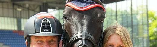 Glückliches Sieger-Trio: Pepo Puch, Fontainenoir und Pferdepflegerin Veronika Pavlasova © CPEDI Mannheim | Rainer Schmid