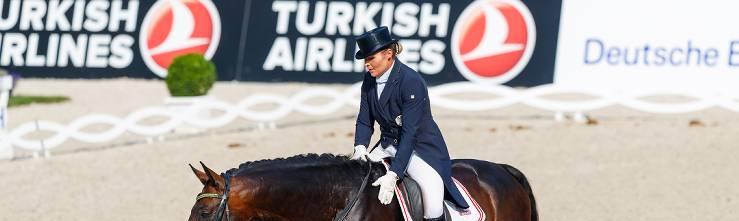 Das Paar wurde seiner Favoritenrolle schließlich auch in allen Belangen gerecht: Der 18-Jährige Cassidy präsentierte sich frisch wie eh und je, piaffierte und passagierte wie ein Uhrwerk, scheinbar mühelos und mit großer Leichtigkeit. Am Ende kam das Duo mit 83,460 Prozent aus dem gut besuchten Deutsche Bank Stadion. Eine verdient hohe Wertung, die Dufour und ihrem Caprimond-Sohn den klaren Sieg in dieser Prüfung bescherte.