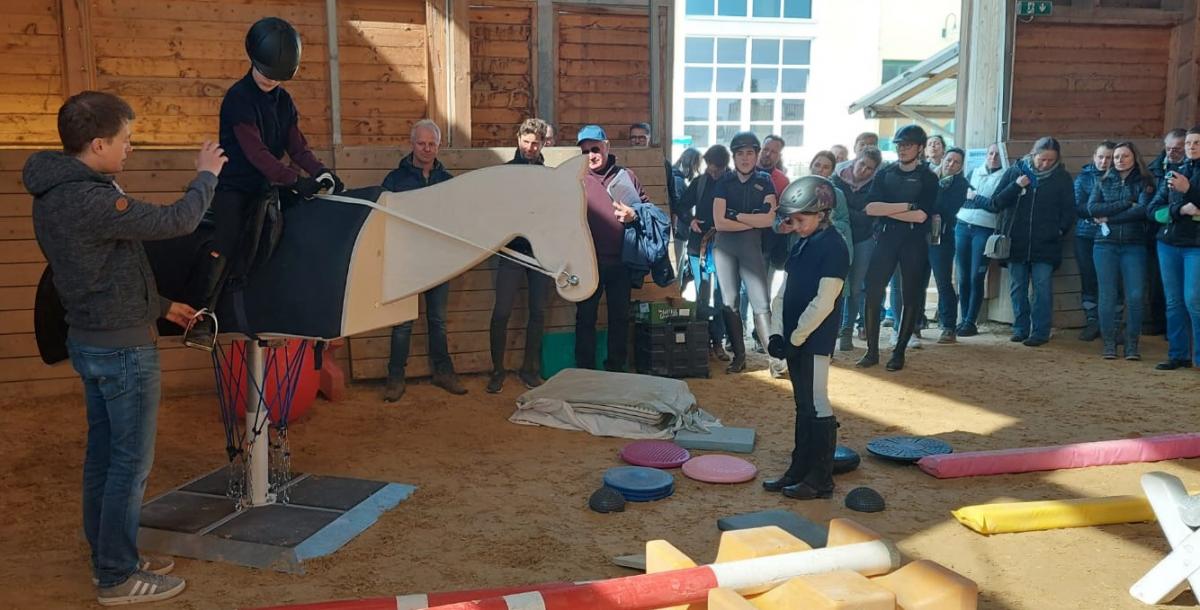 Das Balancetrainingsgerät „Rock on MOVIE“ bot eine eindrucksvolle Möglichkeit, wie die Körperspannung der ReiterInnen auf die Balance des Pferdes wirkt. Dieses Training kam auch den OEPS Talente Team-Mitgliedern der Sparte Vielseitigkeit zugute. Neben dem üblichen Fitness- und Falltraining wurde auf dem Pferdekörper aus Holz auf einem Kugelgelenk der Sitz für alle möglichen Balanceanforderungen im Gelände mit Sportlehrer Andreas Garfenhofer nachgestellt.
