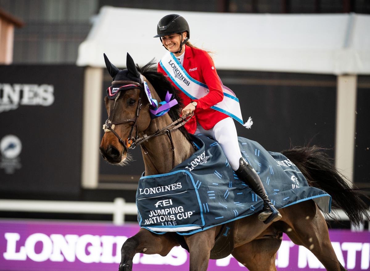 Katharina Rhomberg, die mit Cuma in beiden Runden fehlerfrei geblieben war jubelte über ihren ersten Nationenpreissieg: „Unfassbar und dann gleich in einem 5-Stern-Bewerb! Es waren zwei richtig schwere Runden mit vielen technischen Herausforderungen. Dass Obi, dann auch noch das Stechen gegen Großbritannien gewinnt, ist der Wahnsinn! Es war genau die richtige Entscheidung, dass wir die Einladung in die Emirate angenommen haben. Das gibt Auftrieb für den Rest der EM-Saison.“
