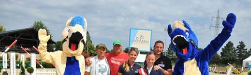 Nachwuchs-Bundestrainer Anton Martin Bauer und ihre Coaches Mario Bichler und Sandra Ziegler jubelten als Marie Christine Sebesta (im Bild oben) in frech gerittenen 44,55 Sekunden im Stechen gemeinsam mit Carrion De Los Condes den Children Grand Prix gewann. Auch die EM-Maskottchen Laky & Lu(c)ky gratulierten im Anschluss der 13-jährigen Siegerin, die heuer auch schon den Children Grand Prix in Linz gewann.