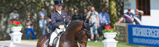 Viel zu tun hatte Wibke Bruns/GER. Die Bereiterin auf Schloss Achleiten brachte vier Pferde in den weiteren beiden Prüfungen des Tages an den Start und kehrte mit zwei Siegen, einem zweiten und einem vierten Platz in den Stall zurück. Mit Schickeria, die im gestrigen St. Georges bereits Rang zwei belegt hatte, gewann sie mit 72,17 Prozent die Einlaufprüfung zum Nürnberger Burg-Pokal. Auf dem zweiten Rang folgte mit 71,12 Prozent der erst siebenjährige Sandro Hit-Sohn San Francisco OLD. Dritte wurde Jennifer Hofmann mit Florentinus V vor Caroline Kottas-Heldenberg auf Darius Rubin.