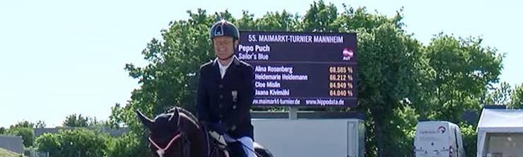 "Reiten ist eine Tugend", sagte Pepo Puch via Facebook als Fazit zum Turnier in Mannheim. Am ersten Tag wollte er nach eigener Aussagen noch zuviel und landete, weil Sailor's Blue in der Trabverstärkung angallopiert, was viele Punkte kostete, hinter der Deutschen Alina Rosenberg auf Rang 2.