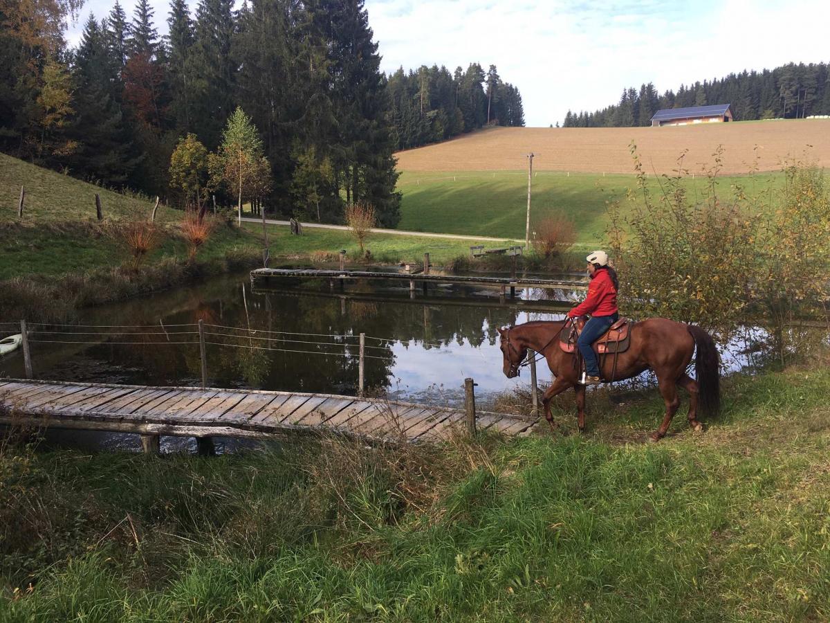 Beim Breitensport Kurs Gelassen ins Gelände in Schönau i.M. (OÖ) mit Ingrid Gampe-Benedict gings rund um das Thema Brücke und Wasser im Gelände. Ob an der Hand oder im Sattel, ob ins Wasser, übers Wasser oder rund ums Wasser – cooles Training an einem tollen Platz!